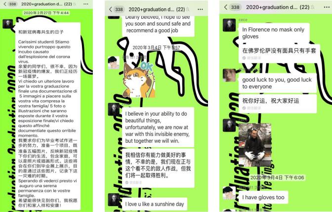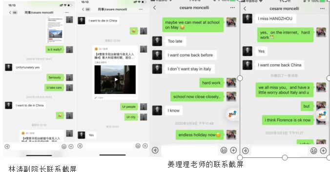 在国内疫情尚未控制住时,他一次次的将行程改签,推迟,不给中国添乱,不给公司增麻烦。当国内疫情控制了,意大利的疫情却在快速增长,他在意大利,与我们一起展开了“停课不停学”,非常主动和教研室叶迎老师共同通过通过微信平台指导员工的毕业设计,用双语一起交流互动与问候。