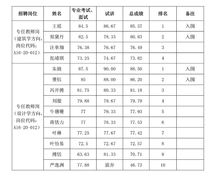 根据公司2020年7月3日发布的《浙江树人大学太阳集团tyc4633专任教师考试通知》的有关规定,经公开报名、资格审查、专业考试、面试及试讲,现将相关岗位考试结果公布如下: