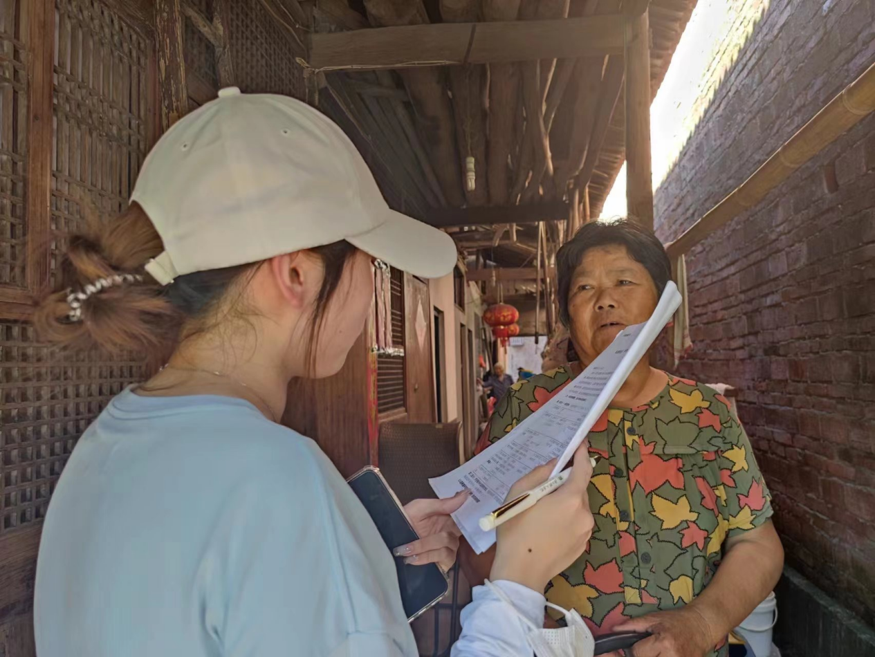 在对村庄进行了大致走访了解之后,第二天我们开始了问卷调查活动。通过随机走访,我们针对六十岁以上的老人进行了调查采访,由于很多老人看不清问卷的字,没有受过文化教育,对填写问卷存在一定的困难,所以我们就将题目念给他们听,挨家挨户地询问老人是否可以接受我们的采访。我们的到来也吸引了很多人的目光,老人们都非常配合还亲切地和我们聊天,经过一天的辛勤付出,队员们顺利地完成了此次问卷调查任务。