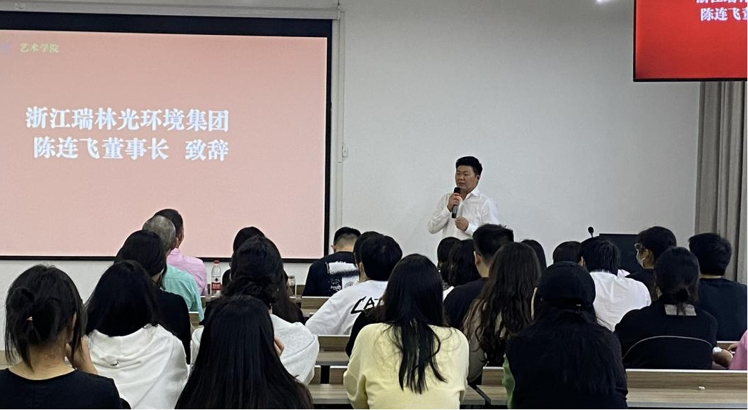 接着由浙江瑞林光环境集团董事长陈连飞先生介绍了浙江瑞林光环境集团发展概况及亚运展馆等实际案例,对校企共建行业公司、共创瑞林光环境设计班培养当下紧缺的光环境设计领域人才表示由衷感谢与祝贺。同时对行业公司2021、2022两届毕业生分别参与第“2021年第十三届中国(徐州)国际园林博览会光环境设计项目”、“杭州2022年第19届亚运会比赛场馆光环境设计项目”展开毕业设计,并集中区域展览做了介绍,并期望通过校企双方共同培养更多的行业领域人才。