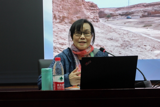 讲座在大家的热烈掌声中开始。陈青洋老师主要从自己“深入生活、扎根人民”的万里单骑走向大家讲述了自己64天西北自驾行的所见、所思、所学。她形象地将其归纳为“丝绸之路”、“佛教西来之路”、“唐宋边塞诗词之路”、“西域古洞窟艺术之路”的“四路合一”。64天的西部之行,陈青洋老师亲历了100多个古洞窟,对古洞窟壁画艺术进行了几乎是全覆盖的准深度考察,画了很多手稿。作为一名美术工作者,她深切感受到了凝固在那片土地上的历史和文化。她表示西北之行最大的感受就是:文化不会跟你没关系,旅途就像是一场文化的溯源,我会从内心深处感觉到一路上的见闻与我有互动的,艺术文化与我在不断交流。