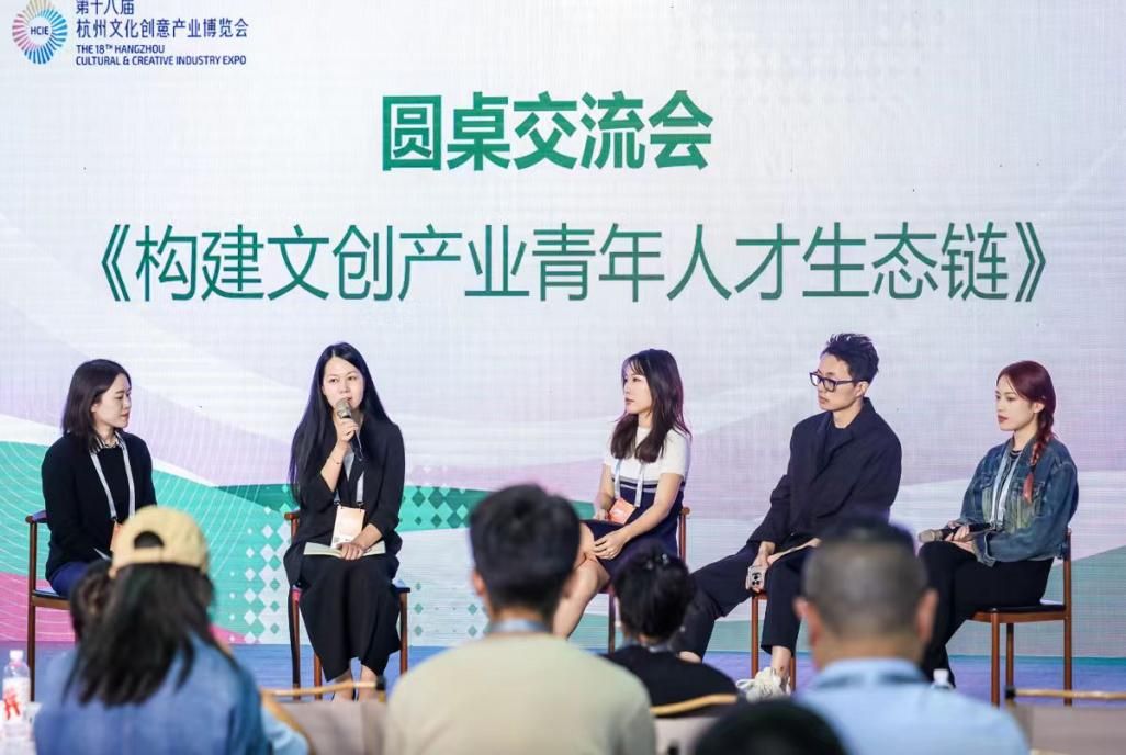 在圆桌交流会环节,杭州市文化产业促进会秘书长、杭州喜牛文化有限公司总经理马飞飞、浙大城市公司视觉传达专业硕士生导师曹蔚然、杭州万物辰新文化科技有限公司总经理杜皓冬、西泠东道(杭州)文化创意有限公司技术总监俞莹莹共同为如何构建文创产业青年人才生态链贡献智慧与力量。