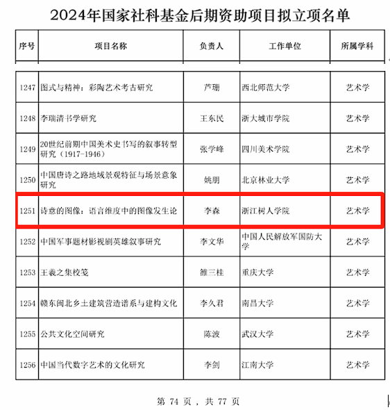 2024年12月17日公示了2024年国家社会科学基金后期资助暨优秀博士学位论文出版、优秀学术著作再版项目立项结果,太阳集团tyc4633李森博士赫然在列。这也是继公司党委书记郑桂玉教授获得国家艺术基金项目之后,太阳集团tyc4633第二项国家级科研项目的立项。李森博士此番能够脱颖而出,无疑是他多年来潜心科研、不懈努力的璀璨结晶,也是他2022年获浙江省哲学社会科学项目立项后的又一个重大收获。