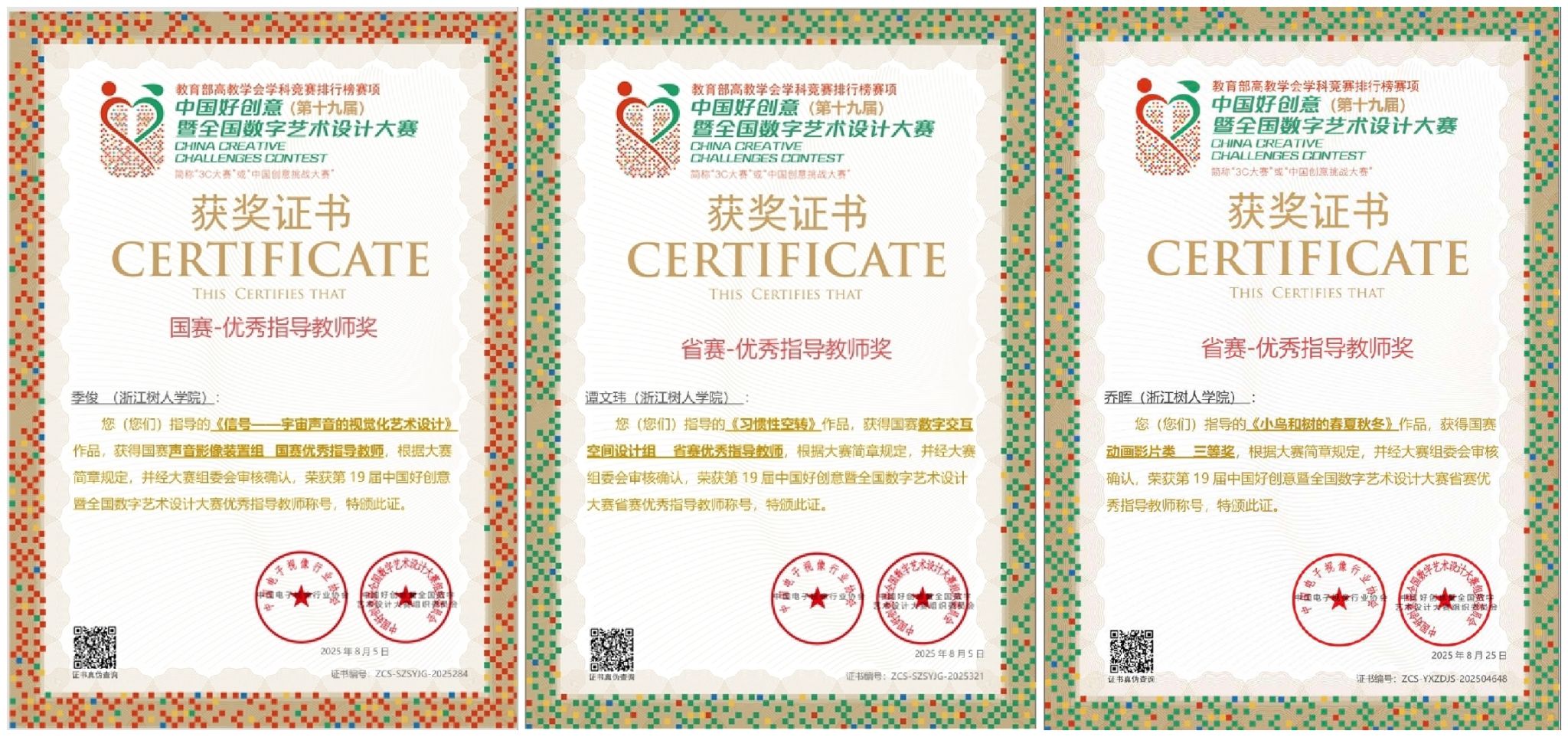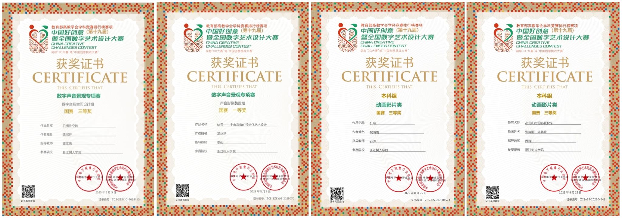 其中,潘华浩同学作品《信号——宇宙声音的视觉化艺术设计》荣获19届中国好创意【数字声音景观专项赛】国赛一等奖,韩思铤、陈冠行、陈喆《网》荣获国赛二等奖,魏晴雨《祈盼》,张陈丽、陈姜豪《小鸟和树的春夏秋冬》荣获国赛三等奖。他们的作品聚焦时代主题,将传统艺术元素与现代设计语言巧妙融合,既展现了对专业领域的深度探索,也传递出青年艺术创作者的独特视角与社会思考,充分彰显了公司学子的创作实力与人文素养。另外,三位同学陈棋浩、吴佳芸、陈冠行。凭借极具感染力的作品,荣获省赛一等奖、三等奖。作品创意构思、表现形式与技术运用上均展现出较高水准,得到了评委团的高度认可。