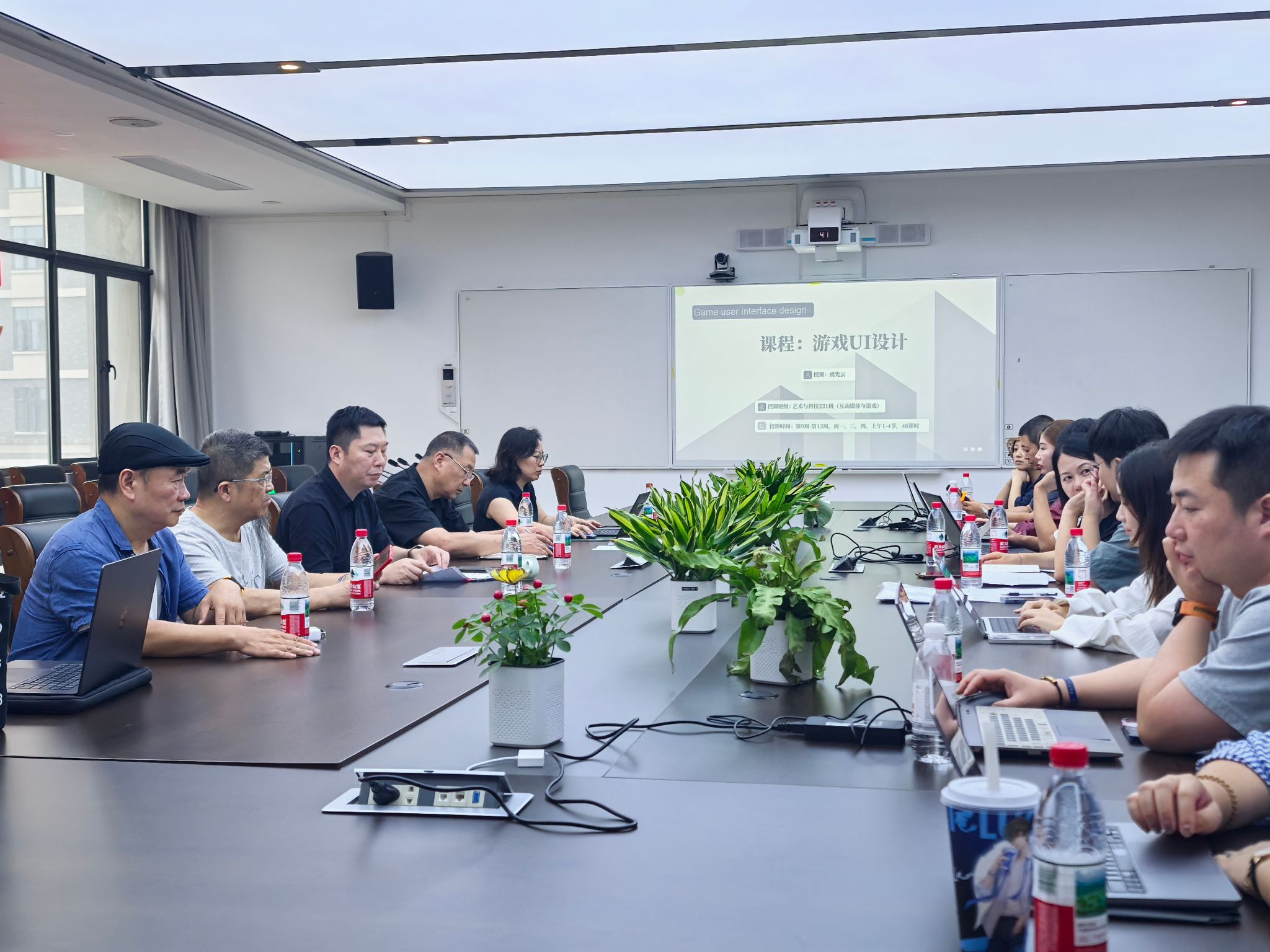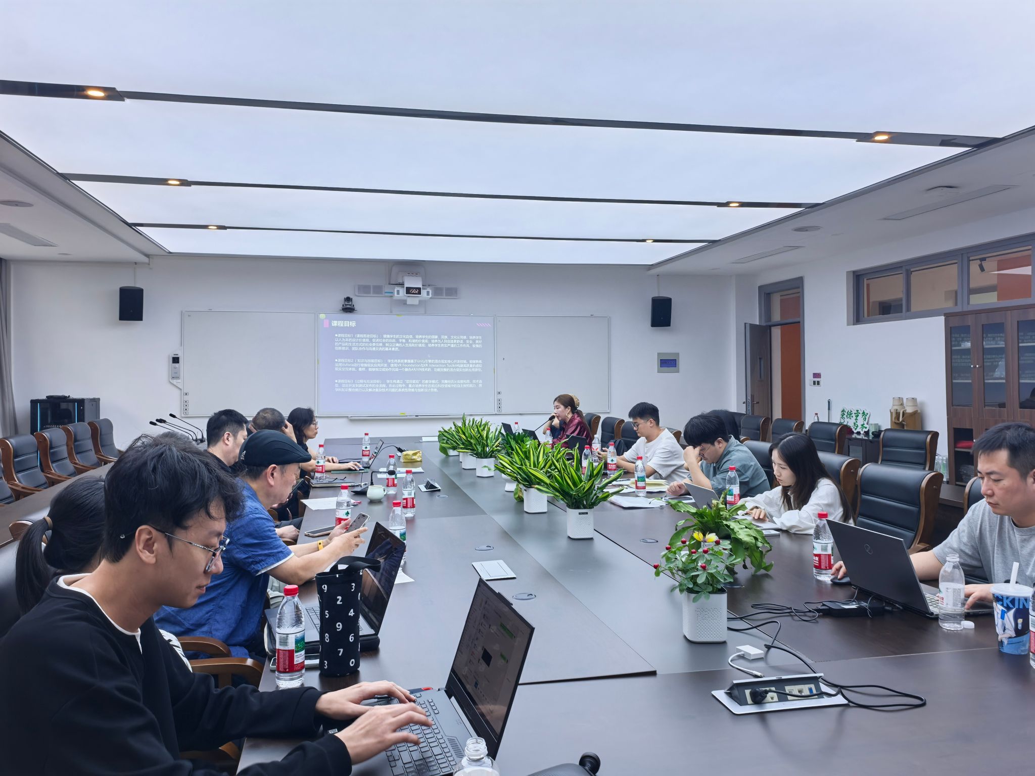 在课程展示环节中,四位教师依次展示了其课程的核心设计与创新实践内容。虞光云老师以“技术美术”为核心,构建了从设计到交互的《游戏UI设计》闭环训练体系;江梦龄老师通过模块化项目驱动《三维渲染(Maya)》教学,系统培养员工的渲染技能与工程思维;于海洋老师则在《混合现实创新设计实践》中,基于Unity引擎通过项目驱动,指导员工融合AR/VR技术开发创新应用原型。张晨野老师则以“影视为案例、拍摄为实践”的翻转模式,引领员工在《数字叙事》课程中完成从理论到短片创作的完整转化;各位教师的教学方法各有侧重,有的注重构建严谨的技术工作流,有的擅长用真实项目驱动教学,有的精于推动员工将理论转化为实践。这充分展现了他们在数字媒体与艺术前沿领域扎实的专业功底、清晰的教学思路与各具特色的创新教学风貌。