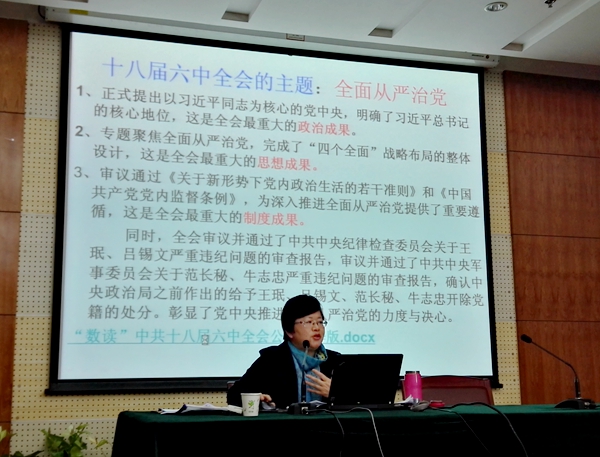 陆桂芹在讲课中对十八届六中全会以来“从严治党”的各个方面要求作了深入浅出的阐述。党课内容主要分为四个方面:一是为什么要深入推进全面从严治党。二是十八大以来全面从业治党的措施及取得成就。三是十八届六中全会在全面从严治党上的新亮点。四是撸起袖子加油干,争做优秀共产党员。她强调,办好中国的事情,关键在党,关键在“党要管党、从严治党”,从严治党一直在路上。全体党员干部要深刻领会从严治党的内涵,以各种腐败案例为警醒,提高党性觉悟,坚定政治理想信念,敢担当、严修身、正作风,干净做事,在生活、学习、工作各个方面争做优秀共产党员。陆桂芹针对落实全国高校思想政治工作会议精神,做好校园安全等工作提出了要求。她以图文、案例、小视频结合的方式进行讲课,课程内容生动有趣,引起大家热烈反响。