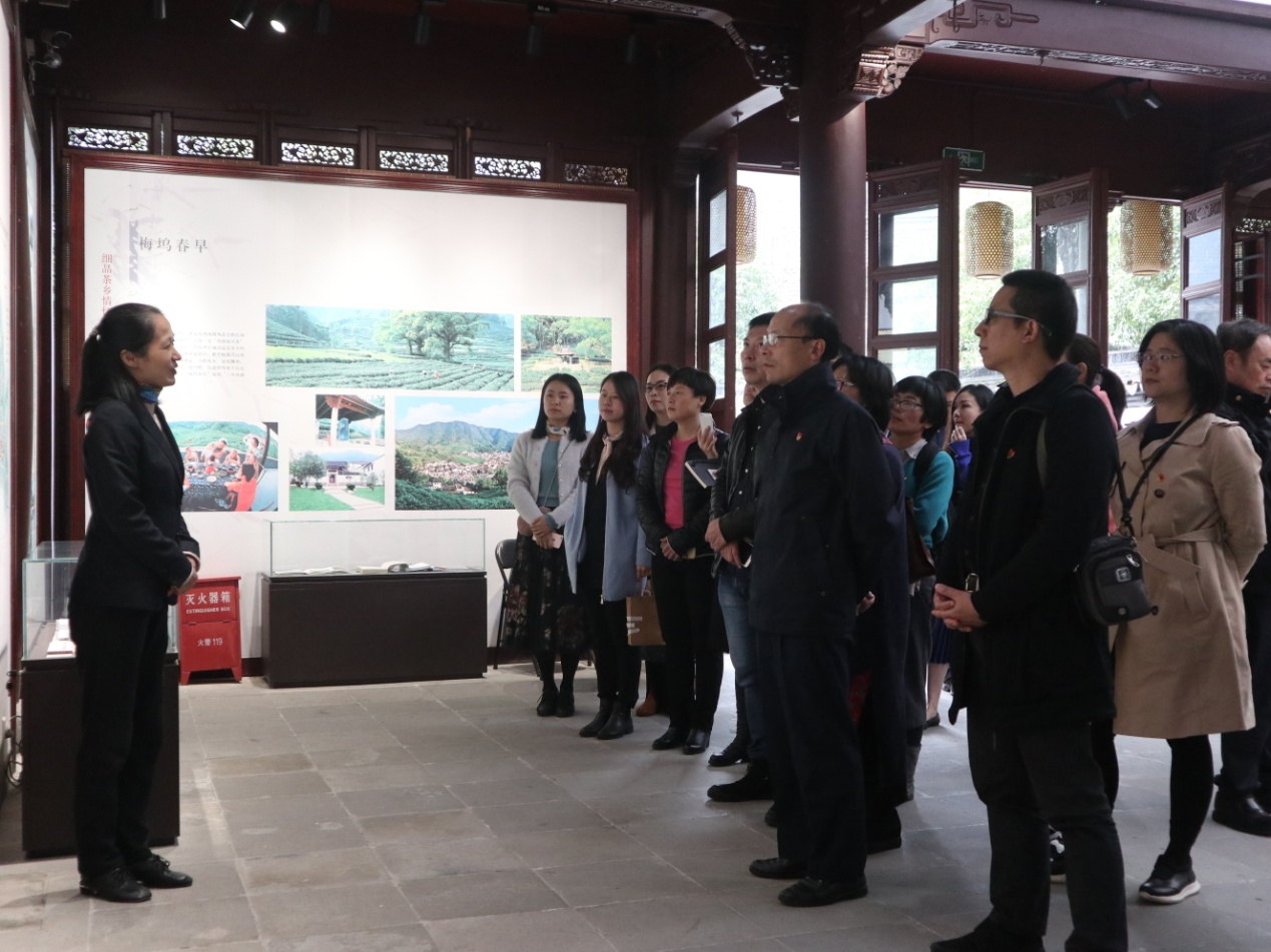 周恩来总理纪念室座落于梅家坞村中心,木结构的房屋古朴典雅,具有江南小四合院的风格,一进门就是周总理的雕像,进入大厅,上方悬挂着总理亲自题写的“为人民服务”五个醒目的大字。纪念室里展示了1957年到1963年间周总理五次在这里考察、工作的照片资料,并陈列了许多珍贵的遗物,我们跟随讲解员的脚步了解到周总理深入梅家坞村、关心茶区发展、到茶园了解当地茶农种茶、采茶、炒茶的情况以及梅家坞村的村容村貌的发展变化。特别是周总理看到炒锅烧水热得满头大汗的茶农,创新性的提出了电热炒茶技术,纪念室里还展出了新中国第一代电炒茶锅。党员们在一张张照片面前驻足思考,真切体会到了周总理一生鞠躬尽瘁为党、为民的感人事迹,周总理高尚的品德、崇高的人格、无私奉献的精神深深铭记在我们的心中。