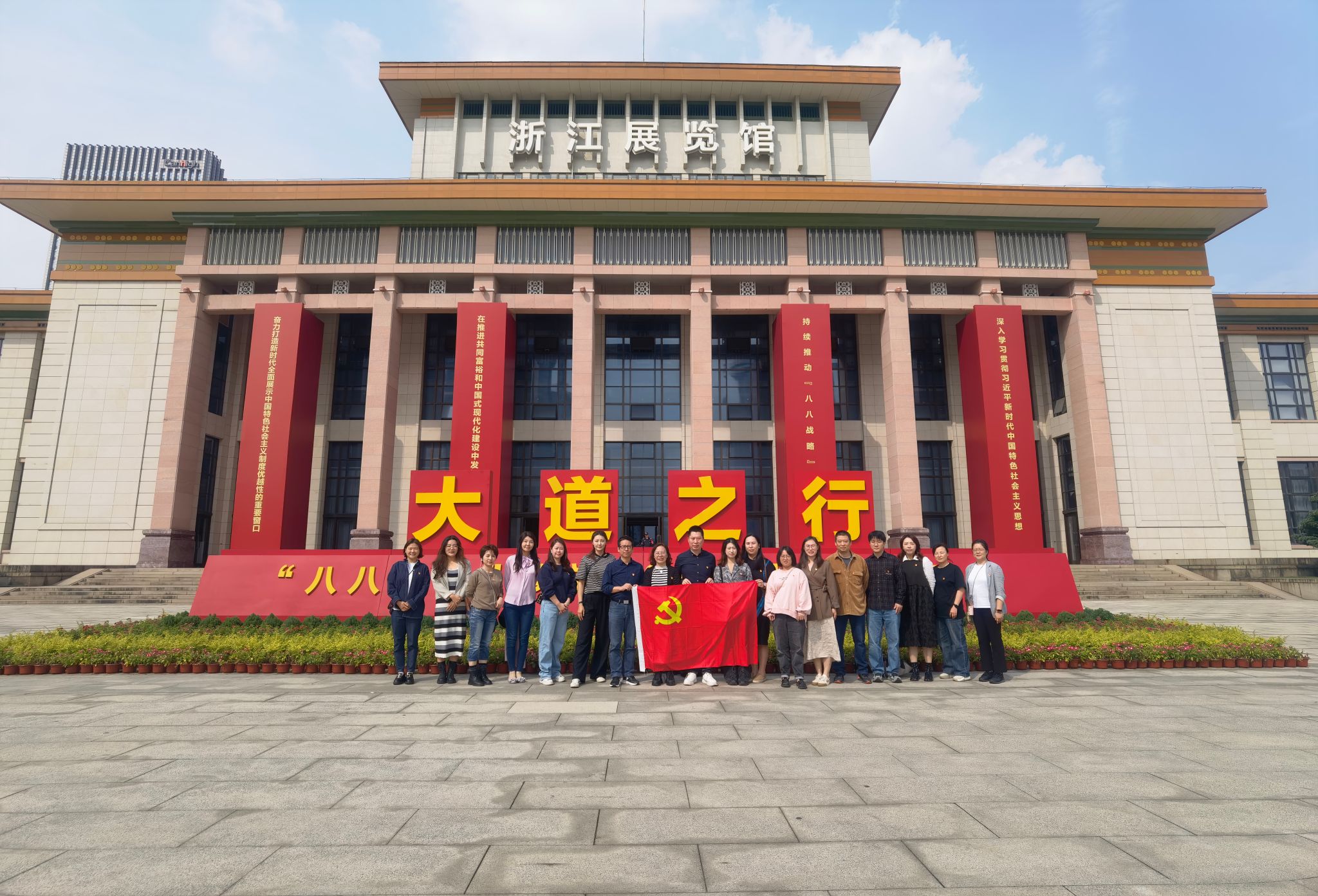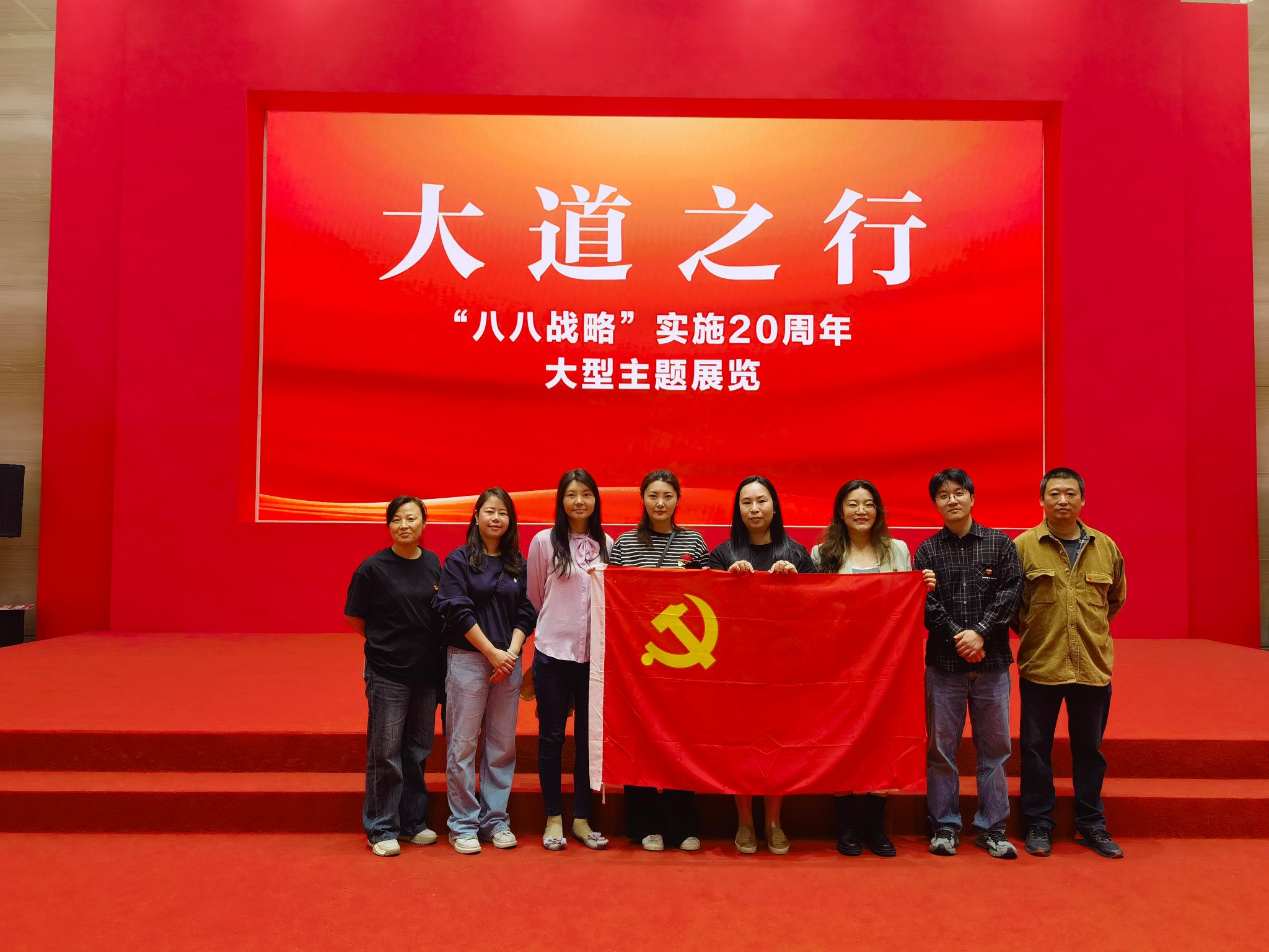追溯思想之源,领悟实践之道,感怀为民之情。公司教工二支部党员在郑桂玉书记带领下,随太阳集团tyc4633全体党员于2023年10月10日下午来到浙江省展览馆参观。我们来到展览馆前,首先被巨大的“大道之行”主题标语所震撼,红底黄色大字令每个人都心生振奋之情,我们在背景板前面合了影,佩戴好党徽,怀着庄重的心情走进展览馆,开启了学习八八战略,浙江20年蝶变之旅。