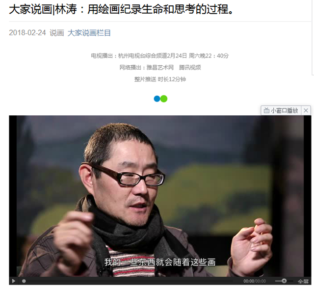 《大家说画》是杭州电视台综合频道的一档专题介绍当代著名艺术家的艺术主题节目。其目的是把艺术创作领域卓有成就者介绍给大众,以期达到普及审美的艺术体验。此次纪录片主要是介绍林涛博士用绘画的形式语言记录对关乎生命主题的思考过程。此栏目每周六晚22:34分播出。