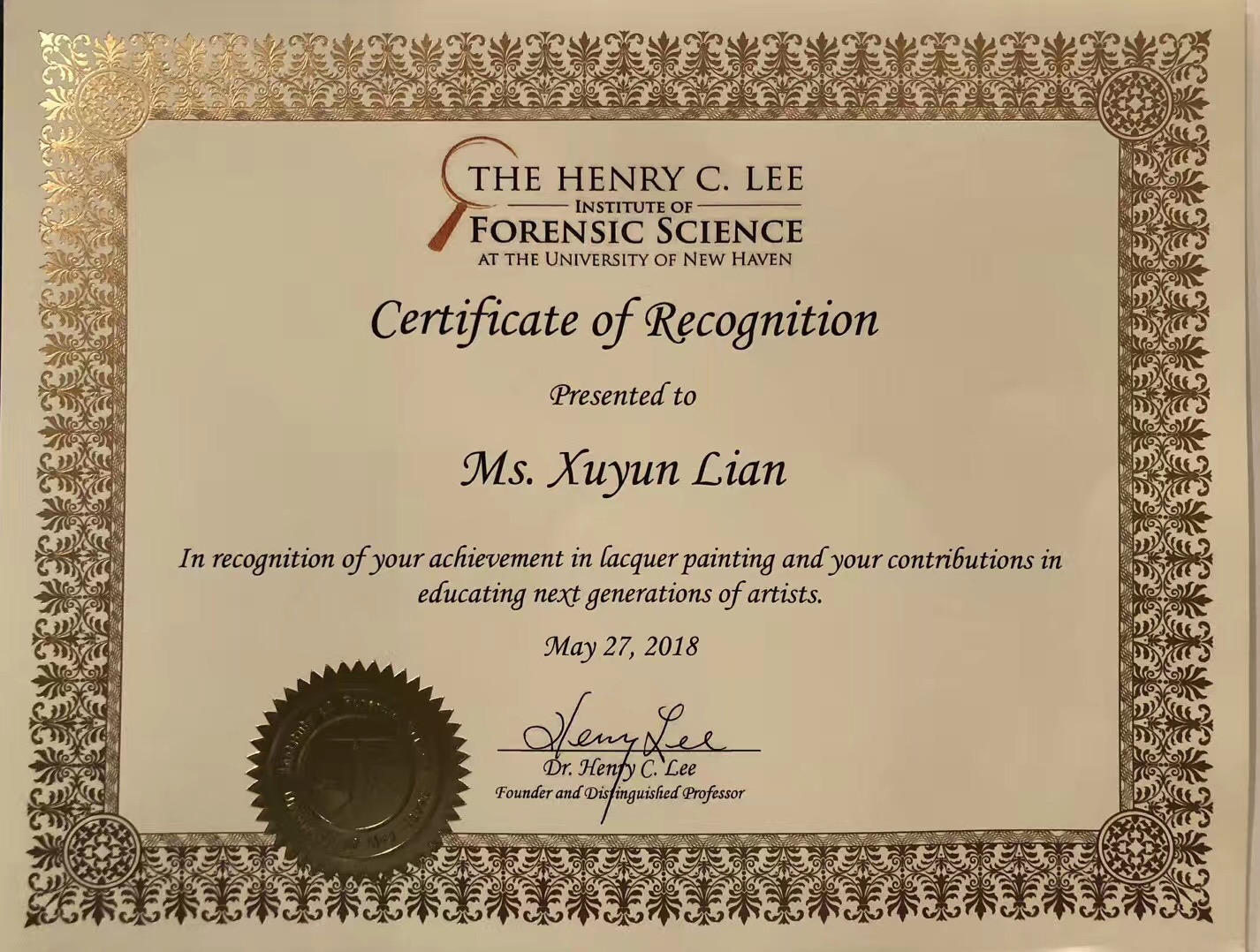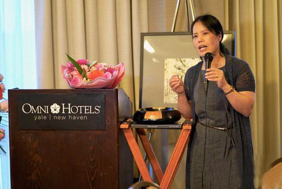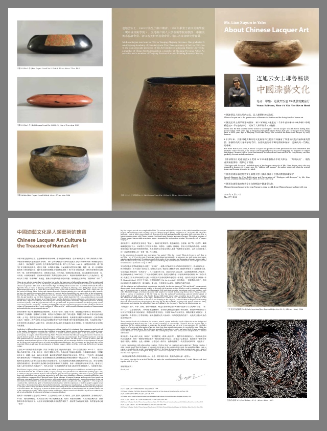 耶鲁大学助理校务卿王芳在致词时代表耶鲁大学对连旭云教授访问耶鲁大学表示欢迎。她说,中国漆艺文化有八千年的历史,在世界上首先使用漆器,是中国创造了漆艺文化。连教授到耶鲁来演讲,把中国古老的、独特的漆艺传到西方来,发扬光大中国古老的漆艺。希望耶鲁的学者员工可以对中国漆艺文化进一步的了解和研究,进一步的发扬光大。随后,李昌钰博士特别代表霍华德·哈里斯博士代表正在中国讲学的李昌钰博士向连旭云教授颁发了嘉奖状,表彰她为中美文化交流所作出的贡献。连旭云向耶鲁大学东亚图书馆、李昌钰刑侦公司、美国“中国作家之家”和在场嘉宾赠送她的画册《漆语·我语》。