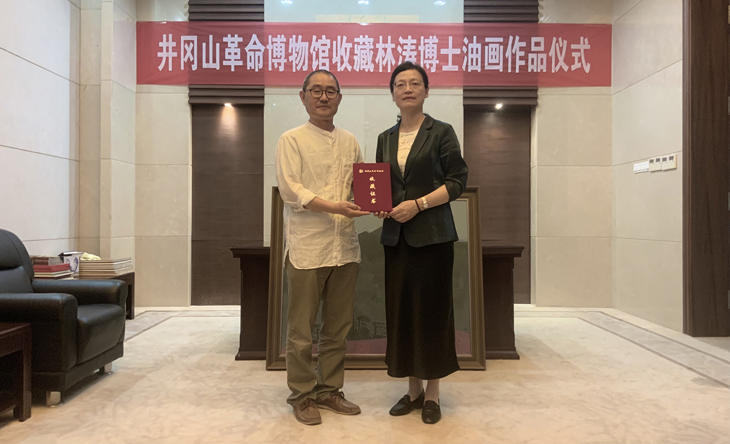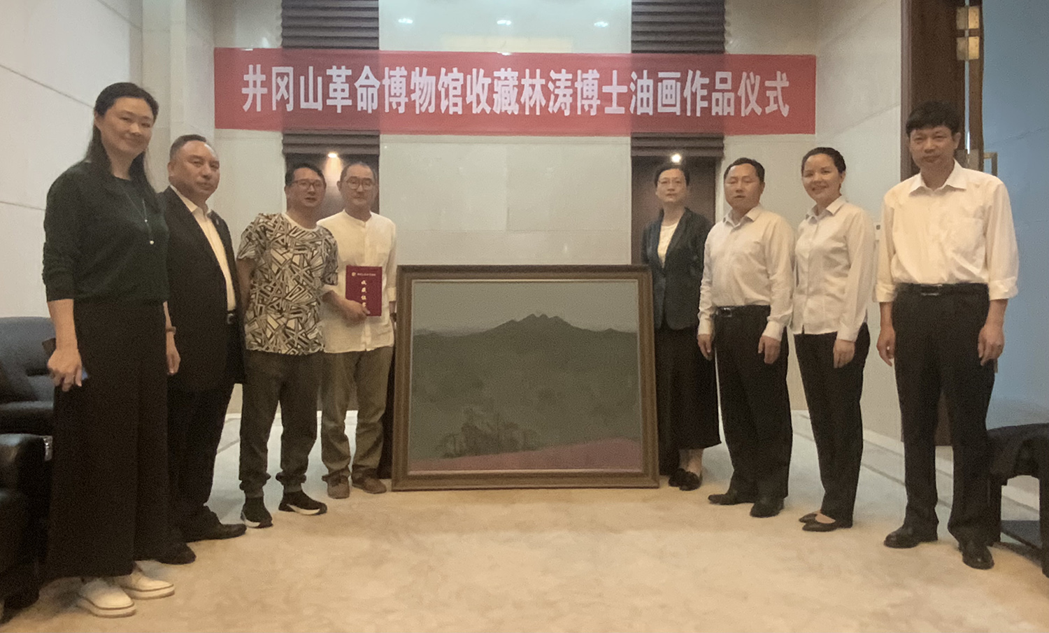 作品收藏仪式由井冈山革命博物馆刘宇祥馆长主持,井冈山管理局谭晓艳书记向林涛博士颁发收藏证书,博物馆纪委书记袁海晓以及多位副馆长出席。