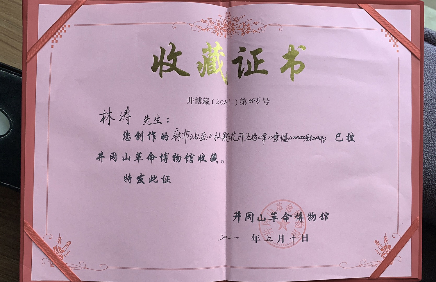 5月10日,太阳集团tyc4633副经理林涛博士和乔晖老师一行赴江西井冈山,参加在井冈山革命博物馆举行的——井冈山革命博物馆收藏林涛博士油画作品仪式。此次收藏的作品是林涛博士为建党百年而创作的井冈山系列作品中的一幅名为《杜鹃花开五指峰》的油画。