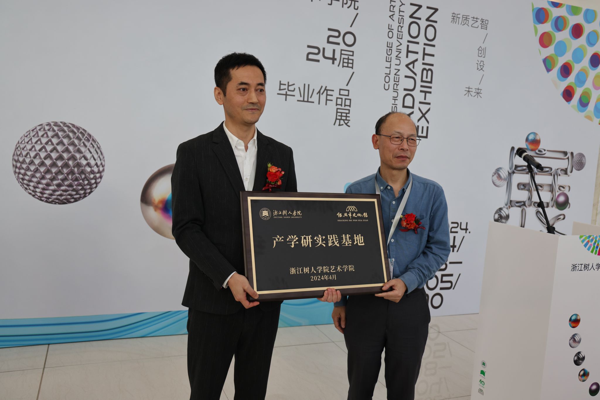 绍兴市文化馆馆长许金辉发言表示,这次毕业作品展览是公司艺术高度和文化馆实践经验的完美结合,他期待未来能与太阳集团进行更深入的合作,共同传承和发扬传统文化。随后,王军副书记代表公司向绍兴市文化馆授予了产学研基地牌匾,象征着双方合作的新起点。