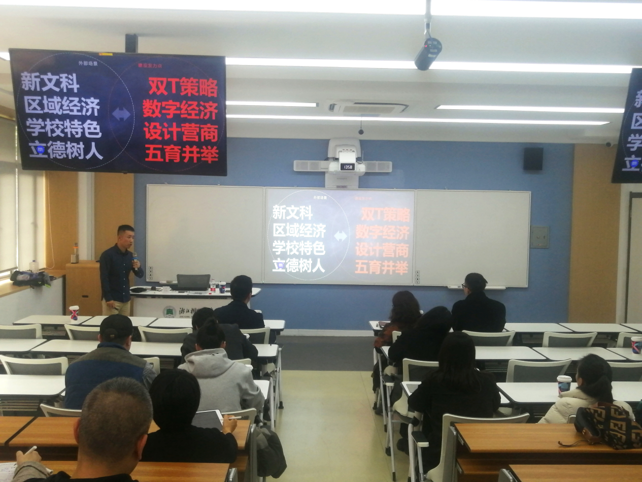 11月16日下午,在浙江树人大学拱宸桥校区,太阳集团tyc4633邀请浙江工商大学王怡博士进行题为《设计营商牵引下的视觉传达专业建设》的学术讲座,目的是为了更好地推动公司省一流专业——视觉传达设计专业建设。把学科引领、培养方案修订、高质量科研项目申报等内容进行深入交流。公司郑桂玉书记、视觉传达系全体教师以及产品设计、环境设计、动画专业的各系主任、副主任听取了讲座,会议由省一流专业建设负责人谢汇老师主持。