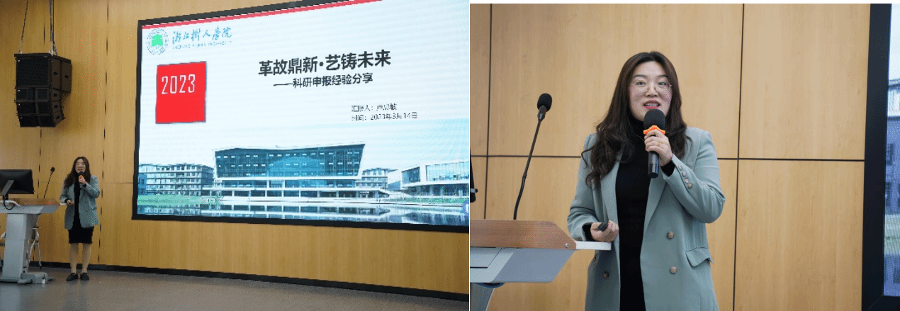 卢忠敏博士以《革故鼎新·艺铸未来——科研申报经验分享》为主题,她强调做科研需要有问题意识,撰写申报书时需要注意申报态度的掌控和语言的斟酌,并详细介绍了各个部分具体的填写内容以及惯用语句、文字格式和图片要求等。