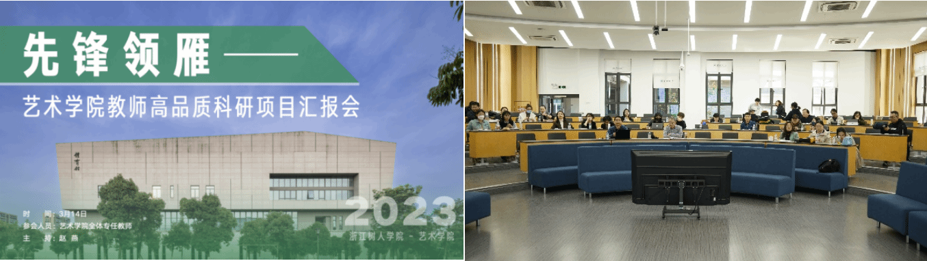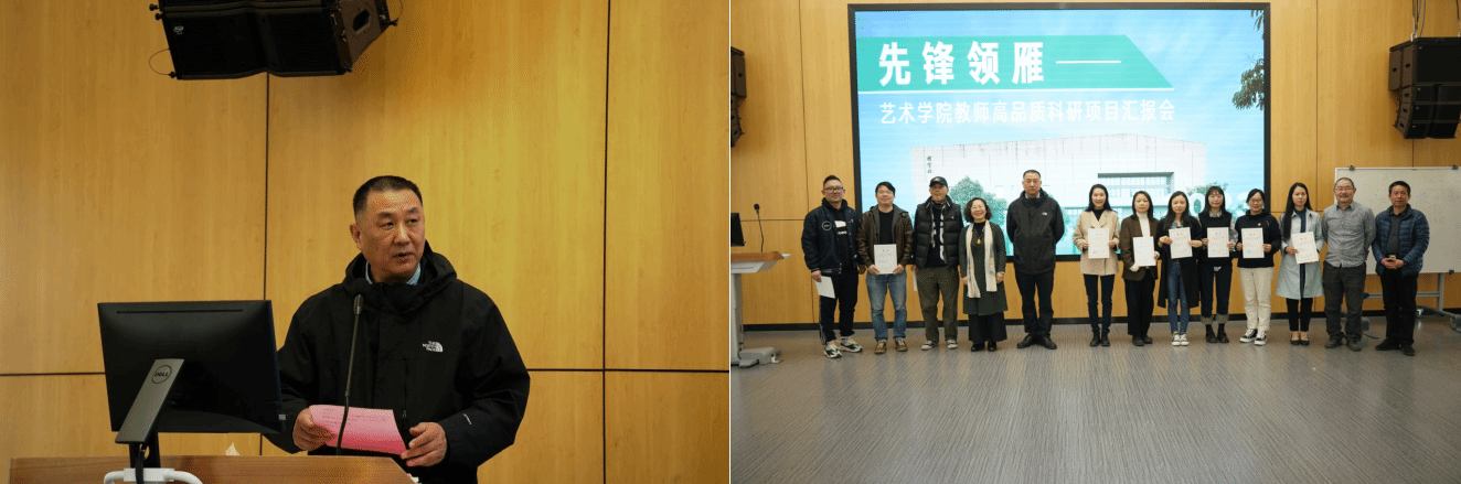 然后,进入高品质项目科研项目汇报会。在郑桂玉书记的《国家艺术基金申报分享》中拉开了序幕。郑书记从项目类型、特色选题和实施路径三个方面进行了论述。她强调要在了解纵向科研项目分类以及各类目要求的基础上,基于国家政策导向和自身优势,寻找选题的突破口。在申报过程的前期,需整合资源优势、搭建可行路径、组建团队团队,到中期的课程体系设置、实施进程安排,以及后期的完成成果规划,都需要做到完善、完备和完美,努力做到精益求精、无可挑剔。最后,郑书记提出在项目申报的道路上一定要保持良好的心态,注重前期积累,坚持不懈、不断尝试,才能获得成功。