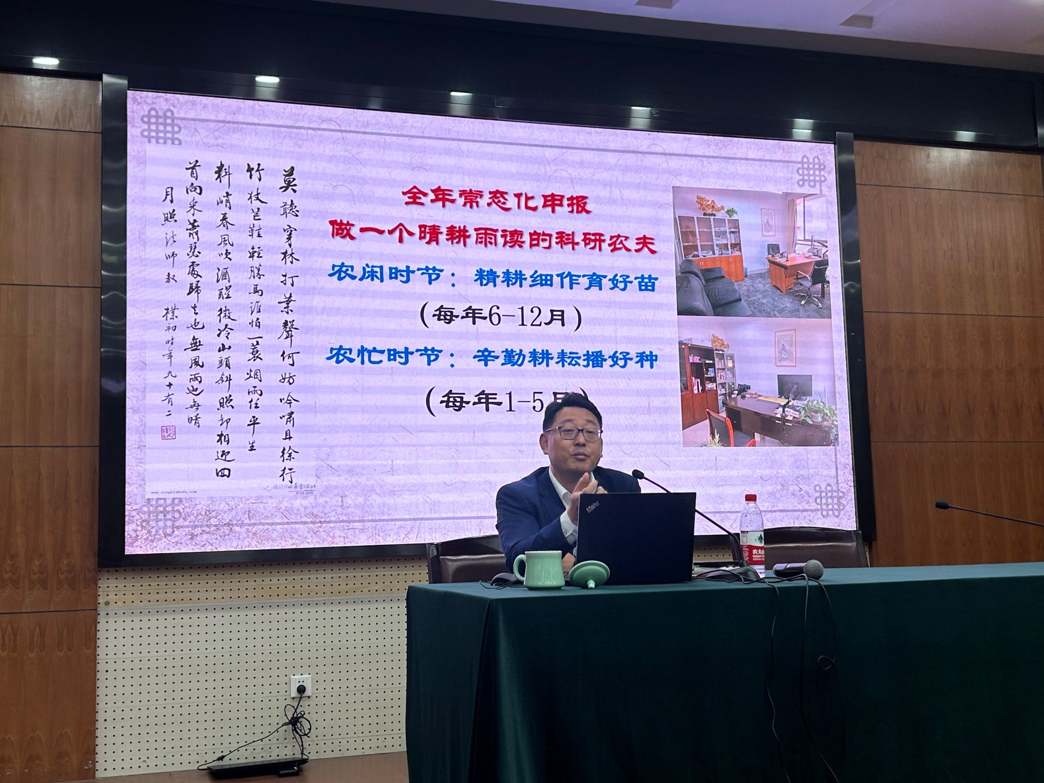 朱旭光教授强调了课题研究需深耕细作,长线培育。深入浅出地阐述了项目申报的各个环节和要点。他以《明朝那些事》的写作方法为喻,强调了在内容积累的基础上,采用“问题导向+科学凝练”的命题方式,鼓励教师们以科研农人的姿态,持之以恒地深耕细作,不断进行田野调查,以汗水浇灌科研之花。