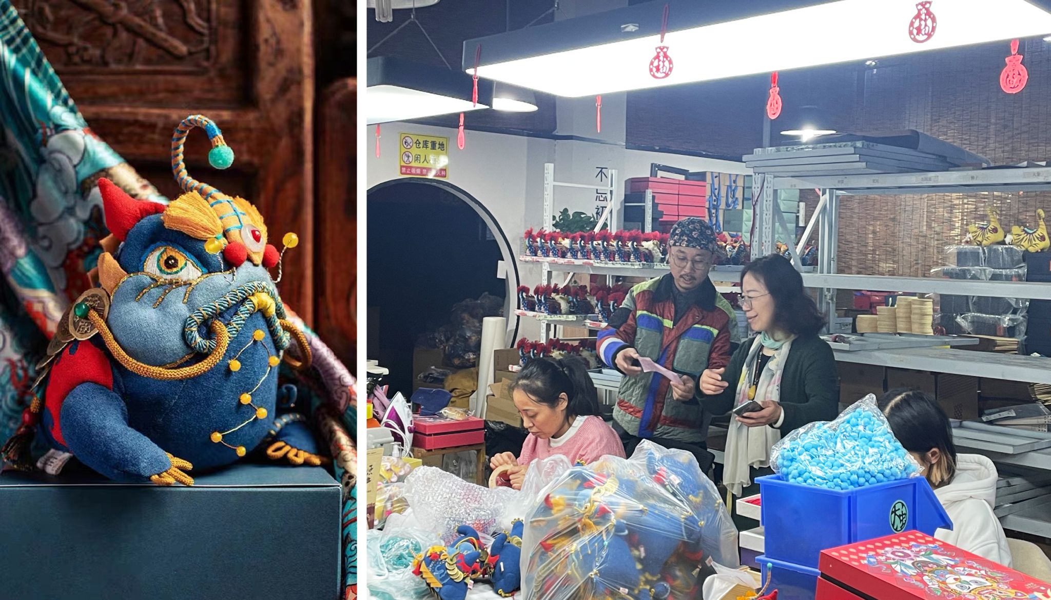 目前,“王的手创”团队从两个人发展为现在近30人的工作室,约1400名绣娘加入刺绣队伍,他们大多是苗族人,也有部分侗族、布依族的村民。仅淘宝店铺的粉丝关注数便有60多万。工作室分为制作和设计两大板块,刚进入文创园区大楼大王便首先带领参观了制作区域。制作团队由5位绣娘流水线操作,巧妙地将五毒金蟾香包的制作工艺分解。该款香包巧妙地融合了中草药与苗绣文化,使一只只生动活泼的金蟾散发出让人安心的香味。
