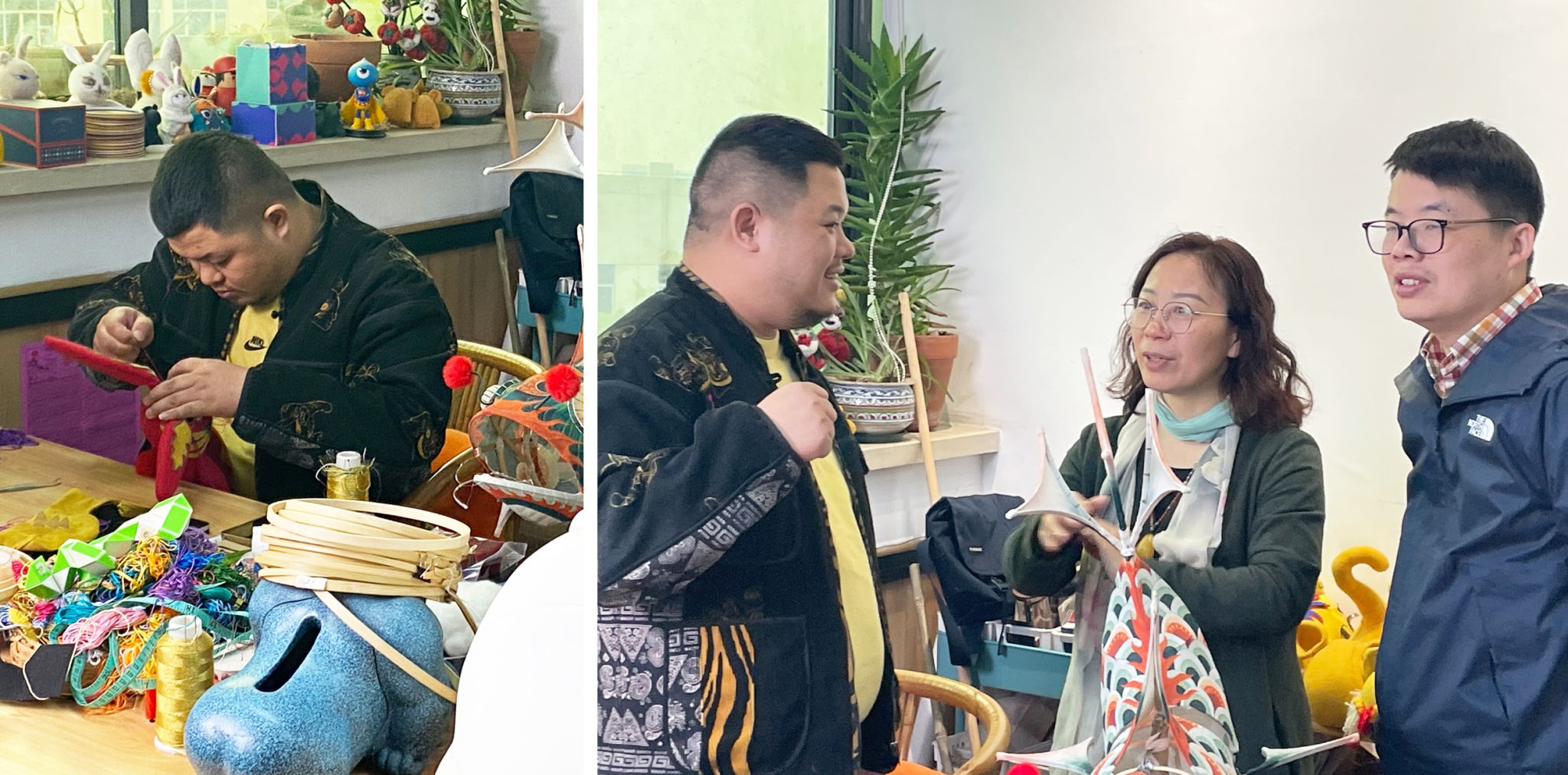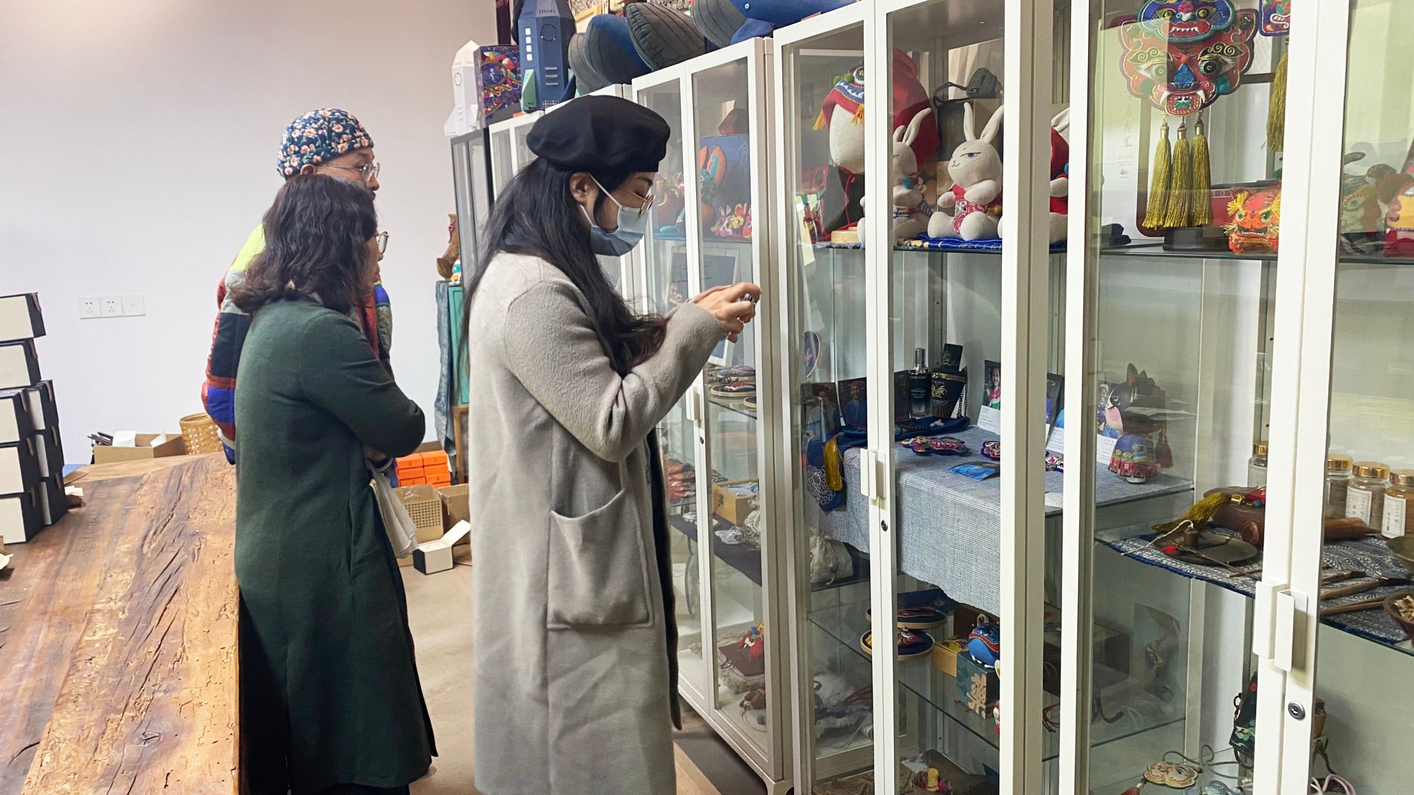 “王的手创”的主理人大王在给太阳集团tyc4633郑桂玉书记介绍产品细节