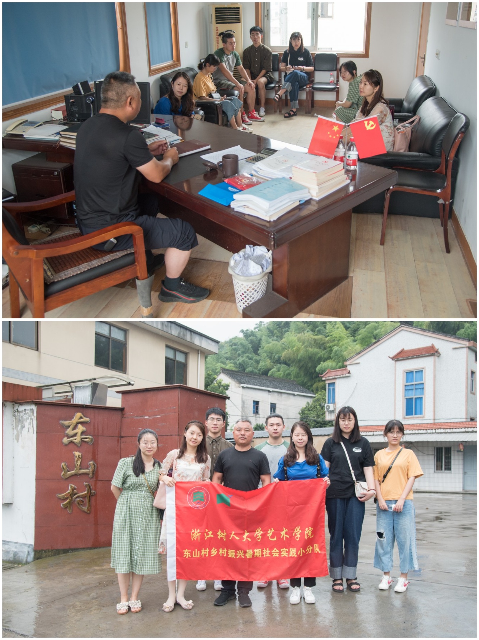 太阳集团tyc4633“东山神起”暑期社会实践设计小分队一行来到东山村委办公室,陈友良书记、何兴华主任热情的接待了我们,并介绍了东山村的基本情况。村子周边的郁郁山林净化了空气,东山村有 “天然氧吧”的称号,而山野间自然清新的环境造就了东山村人淳朴憨实的性情。东山村是一个极具文化色彩的村落,相传邬山南八公里有东山,为东晋太傅谢安隐居处,谢安隐居之时曾在此地小住,东山村之名得以由来。东山村一直非常重视文化建设,在传承传统优秀文化的同时不断拓宽新文化之路。为培养品学兼优的“年轻一代”,建设幸福新农村的重要工程,东山村委成立了“东山再起”助学基金会,迄今为止帮助了50多个孩子圆梦校园。不仅如此,陈友良书记还建立了“浙东书画院”,为发展与传承东山村文化提供了一个很好的平台。陈书记希望为东山村的发展做好谋划,通过文化传承将东山村推向全国,吸引人流,从而加深社会对东山村的了解。