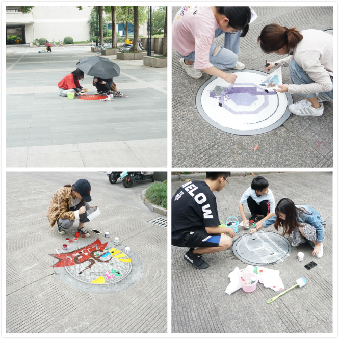 为了将同学们设计创作的作品在校园中呈现,同学们利用周末和课余时间,走出寝室,把110个校园窨井盖彩绘成了一个个精美的图案。这些图案运用众多了中国传统文化元素以及树大元素,以红色为主色调,红红火火凸显了双庆的喜庆氛围,向广大师生传递了青春正能量,给美丽的校园增添了一道靓丽的风景。