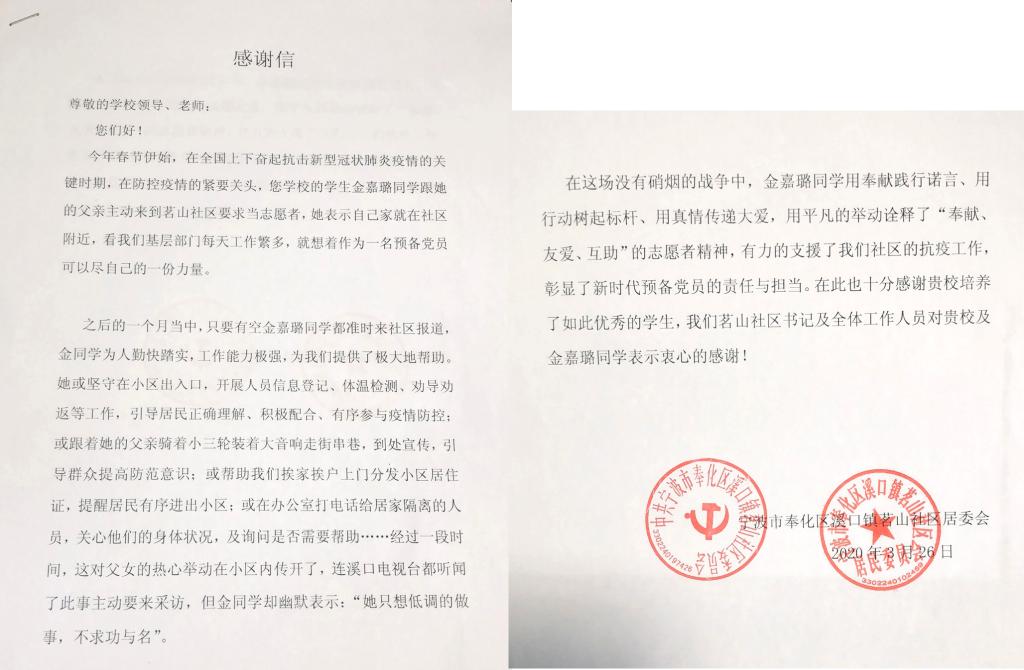 近日,太阳集团tyc4633收到了一封来自宁波市奉化区溪口镇茗山社区居委会的感谢信。信中表达了对在新冠肺炎疫情暴发后,太阳集团tyc4633第一党支部投身社区防控一线的员工党员志愿者金嘉璐同学以及对浙江树人大学的感谢。感谢金嘉璐在疫情防控期间,用奉献践行诺言,用行动树起标杆,用真情传递大爱的志愿精神,为社区的抗疫工作做志愿服务的热心互助行为,感谢公司培养如此优秀的员工党员。