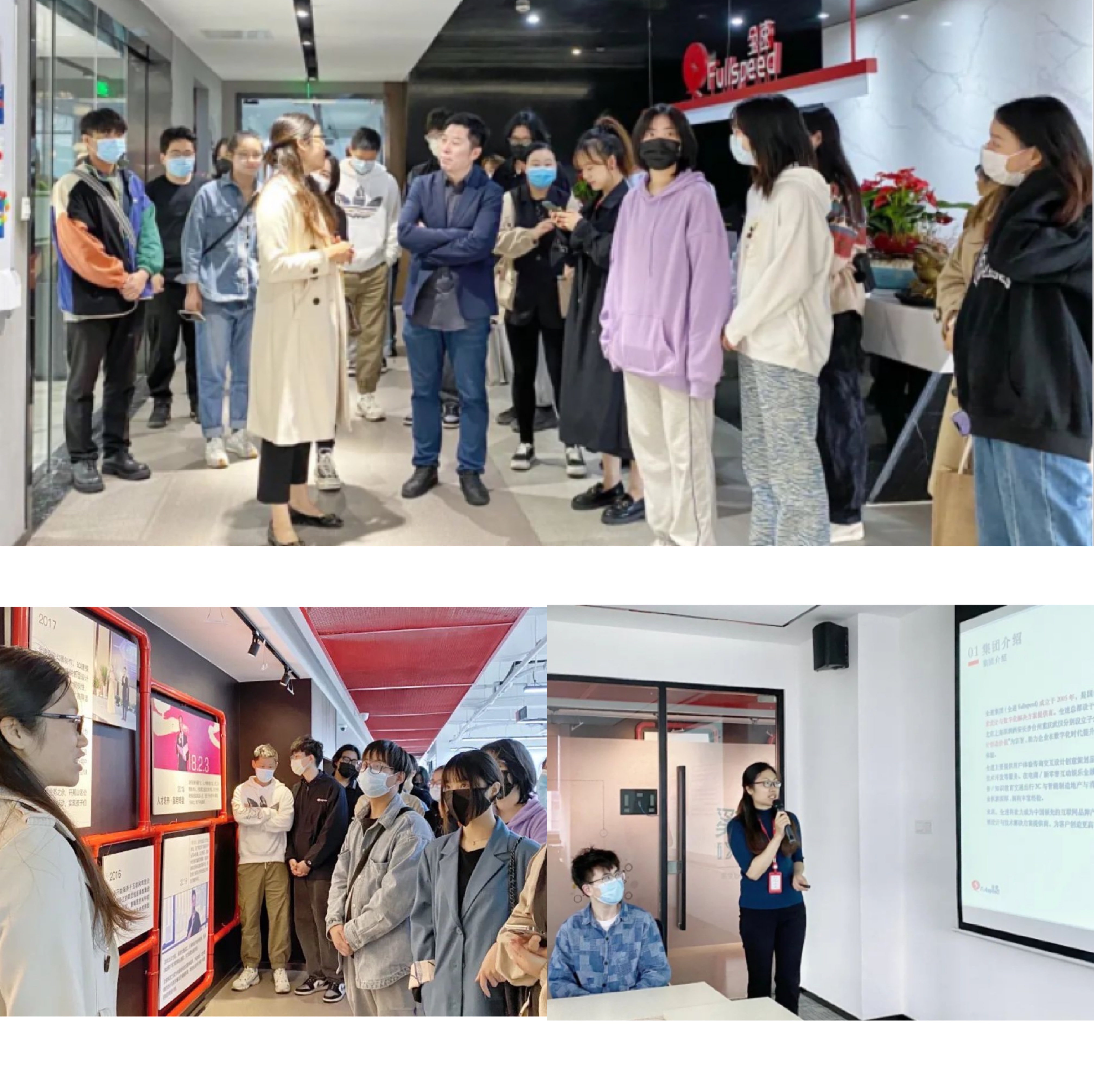 仪式开始前,全速集团教育事业群总经理洪德志、校企合作经理张春燕、校招主管周善丽带领老师和同学们参观公司办公场所并介绍了全速集团的发展历程、目前发展现状、业务方向以及人才需求。