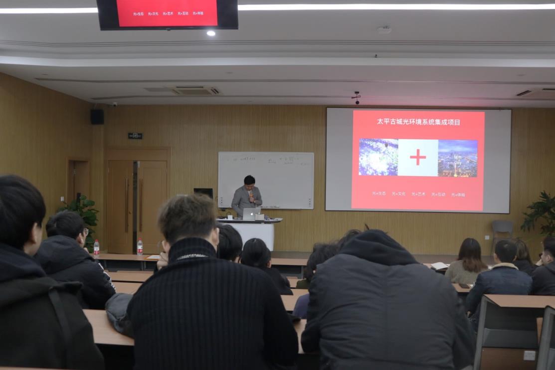 陈总的行业导入讲座向师生们详细讲解了他们集团的部分典型案例,“第十二届中国(南宁)国际园林博览会”建筑照明设计项目;“广西·崇左太平古城”光环境系统集成项目等4个光环境设计项目,从方案的策划、投标书的撰写、项目的3D建模、视觉导视设计、文化元素的设计等一体化操作流程,通过精彩的视频演示和实景照片进行展示。讲座中,陈总还以学长的身份向学弟学妹们分享了做人做事的感悟与体会,强调为学日益、为道日损,内与外要做到“知行合一”。不仅让同学们了解了光环境设计与执行落地的整个流程,供感受到了项目所需要的各方面知识与能力,给同学们上了一堂生动的职业导入课。